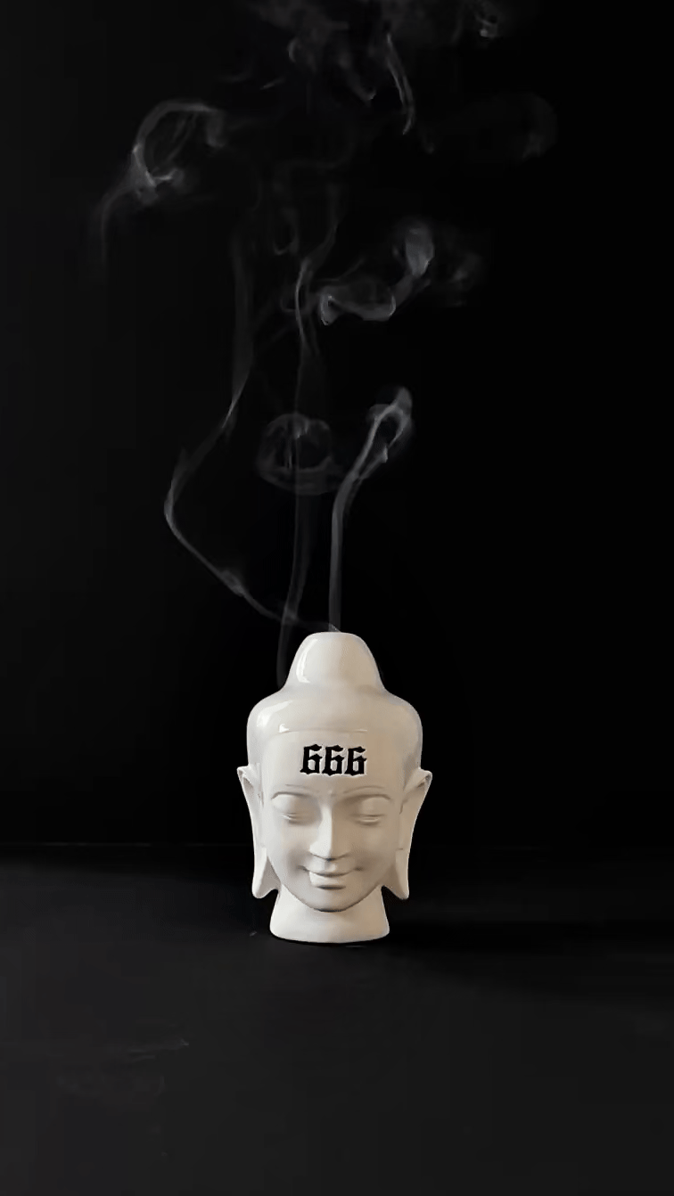 이 작품은 서울디자인페스티벌에서 영 디자이너로 선정되어 전시되었습니다. 작품의 제목은 무타입니다. 무타는 '이유가 없다'는 뜻입니다. 이마의 666은 어떤 사람에게는 악마의 숫자처럼 보일 수 있지만, 어떤 사람에게는 그저 숫자에 불과합니다. 이 작품을 통해 우리가 편견과 고정관념에 얼마나 쉽게 순응하고 있는지에 대해 환기를 해주고 싶었습니다. 무언가를 판단하는 기준이 종교나 외형이 되어서는 안 된다는 메시지를 전달하고자 했습니다.